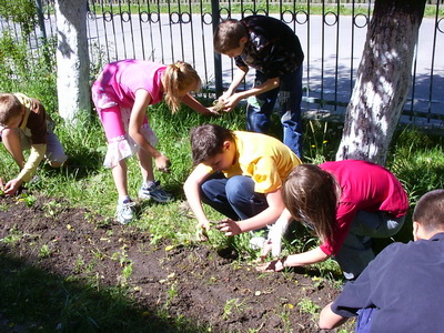 Cu ocazia venirii primăverii s-au plantat flori şi s-a înfrumuseţat spaţiul verde din faţa şcolii - mai 2007.